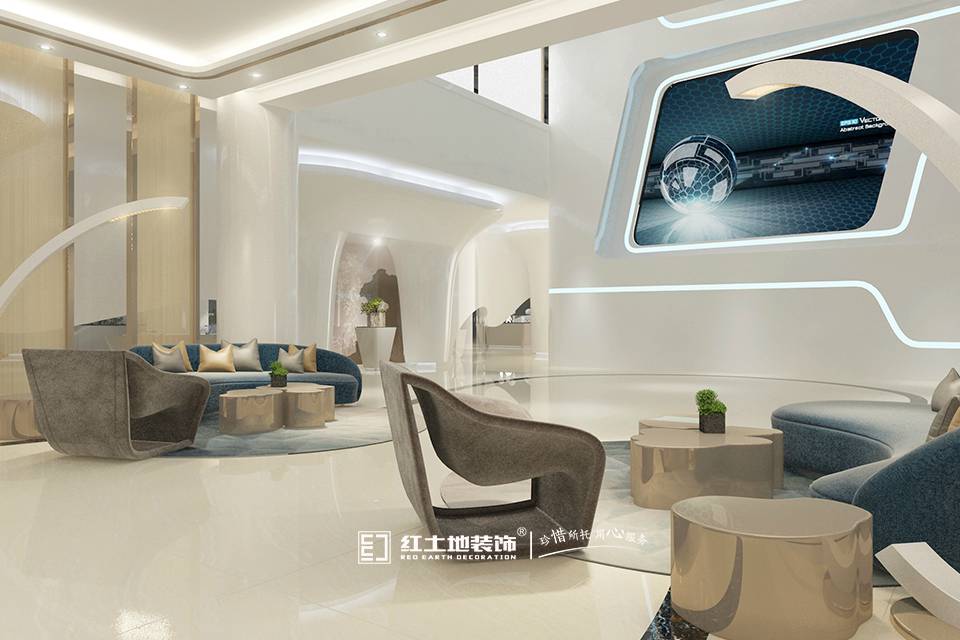 設(shè)計(jì)說(shuō)明:建筑設(shè)計(jì)中,圓和曲面、弧位是解構(gòu)主義和未來(lái)科技派別設(shè)計(jì)核心。視覺(jué)沖擊上,曲面和弧位一直都是吸引視覺(jué)的第一造型元素。故設(shè)計(jì)理念亦以曲面、弧位、圓形作為設(shè)計(jì)核心。作為企業(yè)的前臺(tái)、大堂、企業(yè)文化和產(chǎn)品展區(qū),一直都是吸引客戶(hù)視覺(jué)傳遞的第一環(huán)境,其規(guī)模、實(shí)力弘厚程度都會(huì)在這里表現(xiàn)出來(lái)。